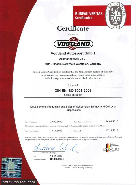 Grazie alla nostra costante attenzione alla qualità del prodotto, si può essere certi che un prodotto VOGTLAND funzionerà correttamente nel suo impiego previsto, e fornisce la qualità duratura che si desidera. VOGTLAND è un membro attivo del SEMA (il Market Association Specialty Equipment) e VDAT che è l'Associazione tedesca di automobilistica.
